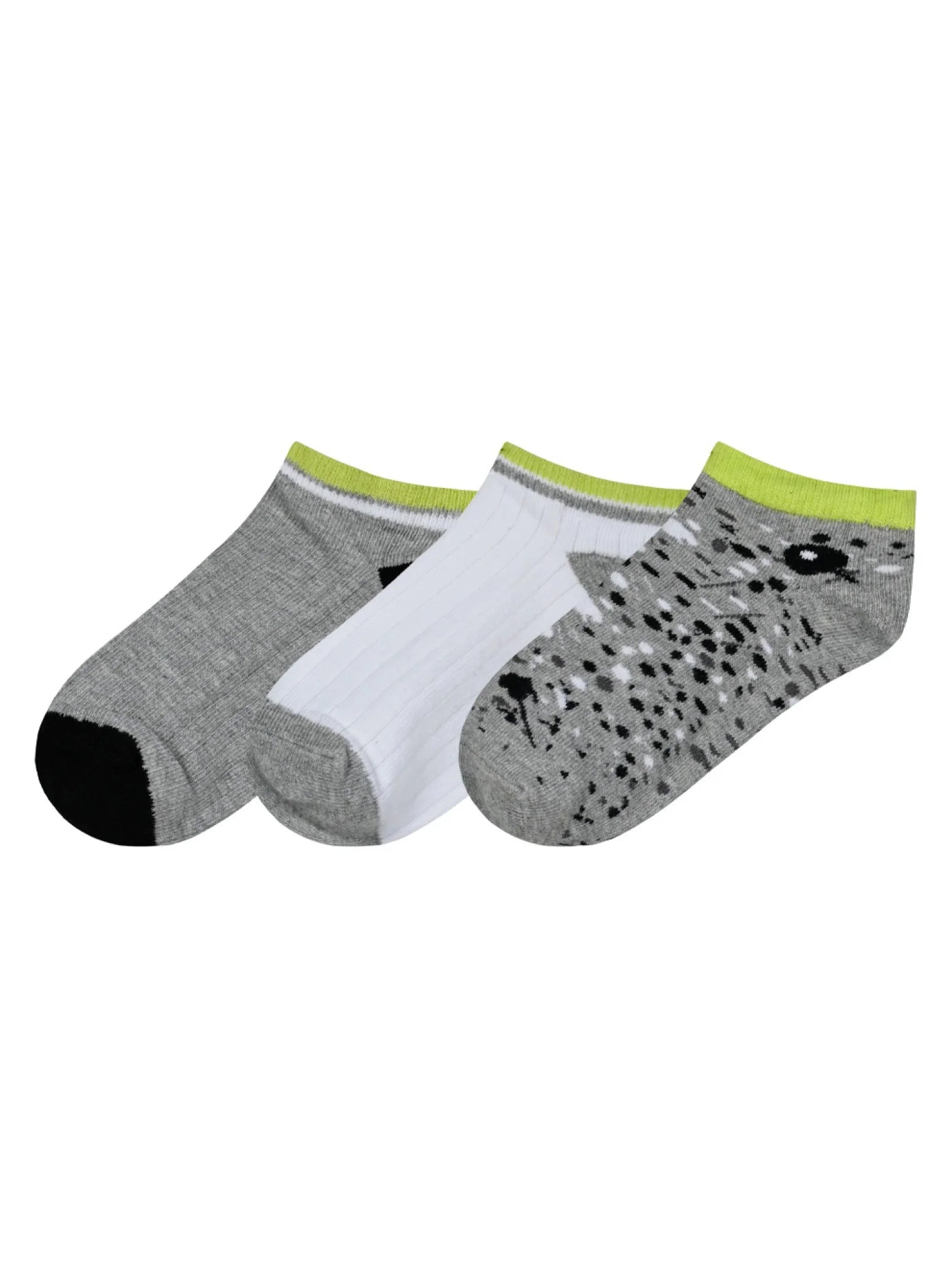 Ανακαλύψτε το ιδανικό σετ παιδικών καλτσών για άνεση και στυλ! Το σετ περιλαμβάνει 3 ζευγάρια χαμηλές κάλτσες σε γκρι, λευκό και μοτίβο με σχέδιο, με διακριτικές λεπτομέρειες σε πράσινο και μαύρο. Κατασκευασμένες από απαλό και ανθεκτικό ύφασμα, προσφέρουν τέλεια εφαρμογή και προστασία για τα μικρά ποδαράκια. Ιδανικές για καθημερινή χρήση, εξασφαλίζουν ευκολία στην κίνηση και άνεση όλη μέρα. Βρείτε τις στο Tsakalino.gr!
