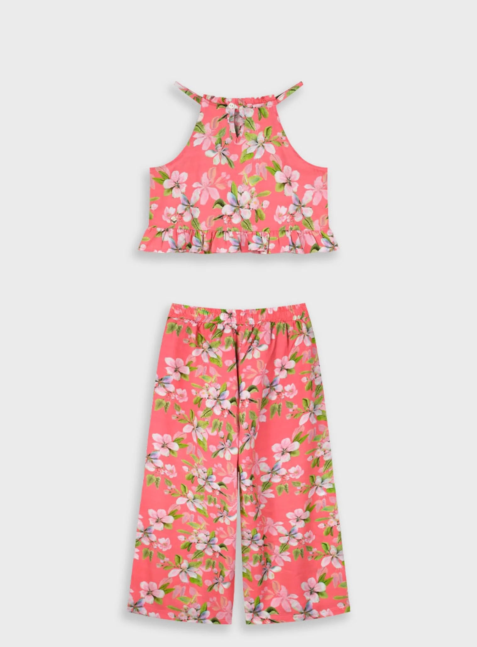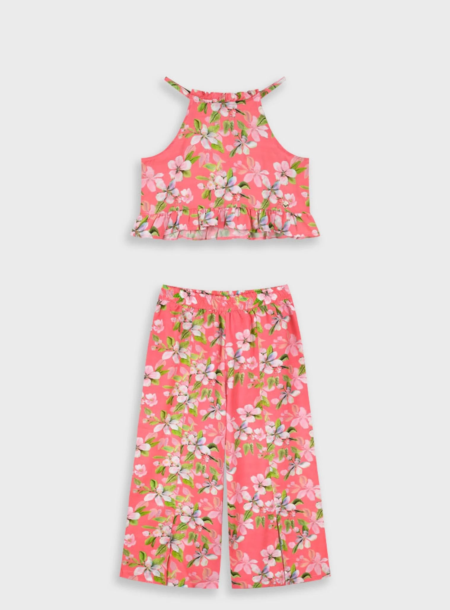 Ανοιξιάτικο και κομψό παιδικό σετ για κορίτσια, που περιλαμβάνει αμάνικο τοπ με βολάν στο τελείωμα και ασορτί παντελόνα με φαρδύ πόδι. Σε ζωηρό ροζ χρώμα και φλοράλ μοτίβο με λευκά και ροζ άνθη, ιδανικό για καλοκαιρινές εμφανίσεις, βόλτες και διακοπές. Το τοπ διαθέτει λεπτές τιράντες και άνετη γραμμή, ενώ η παντελόνα έχει ελαστική μέση για άνεση στην κίνηση. Ένα σετ που συνδυάζει στυλ και πρακτικότητα για κάθε μικρή fashionista!