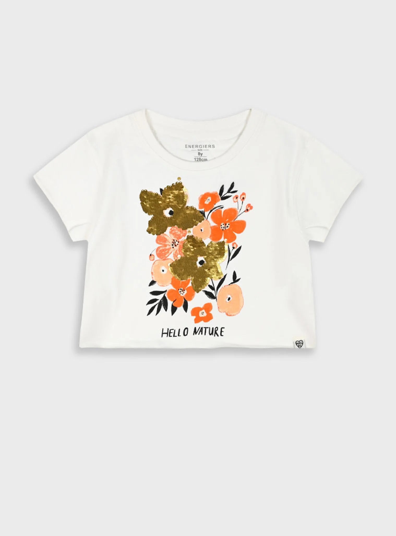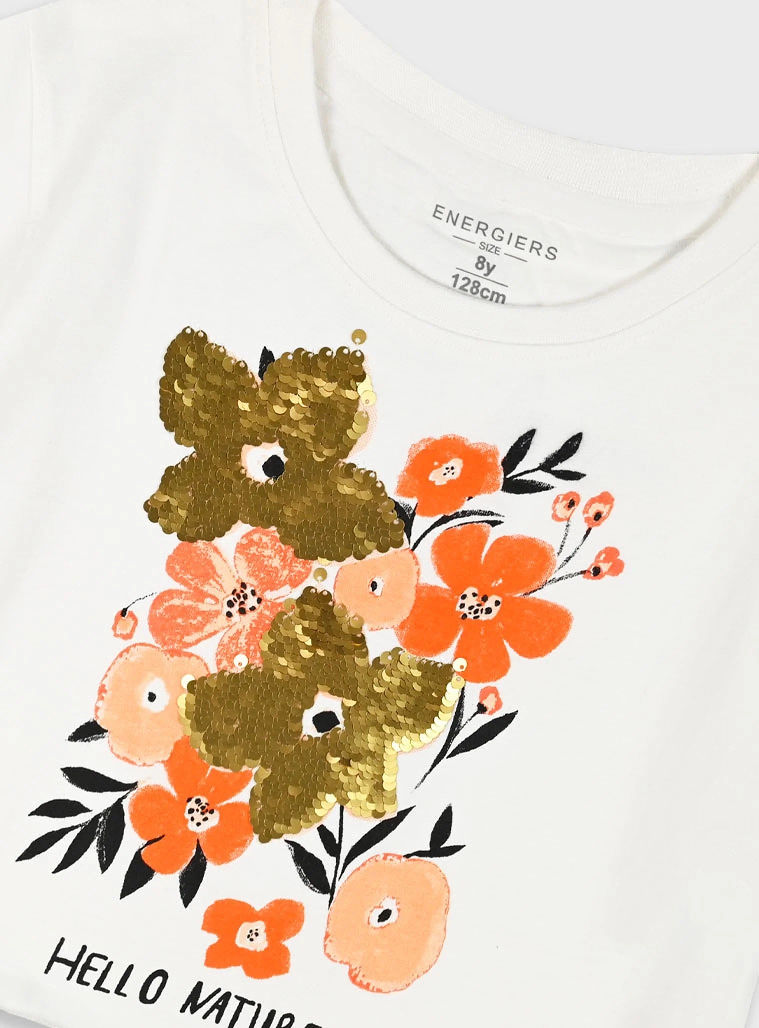 Χαρίστε στυλ και λάμψη στην καθημερινότητα της μικρής σας με αυτή την υπέροχη παιδική μπλούζα κοριτσιού από την Energiers! Σε λευκή απόχρωση, διακοσμημένη με εντυπωσιακό λουλουδάτο τύπωμα και χρυσές παγιέτες σε σχήμα λουλουδιού που τραβούν τα βλέμματα. Η φράση "Hello Nature" προσθέτει μια παιχνιδιάρικη, οικολογική πινελιά στο ντύσιμο. Κατασκευασμένη από απαλό βαμβακερό ύφασμα για απόλυτη άνεση και ευκολία στην κίνηση. Ιδανική για ανοιξιάτικες και καλοκαιρινές βόλτες!